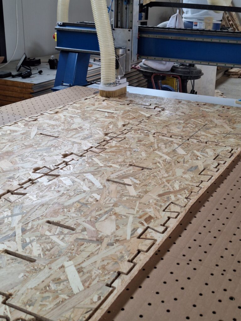Svi dijelovi su CNC rezani prema BIM modelima, koristeći sistem mehaničkog spajanja drvo–na–drvo bez ljepila, čime se potvrđuje inovativni i ekološki pristup gradnji.